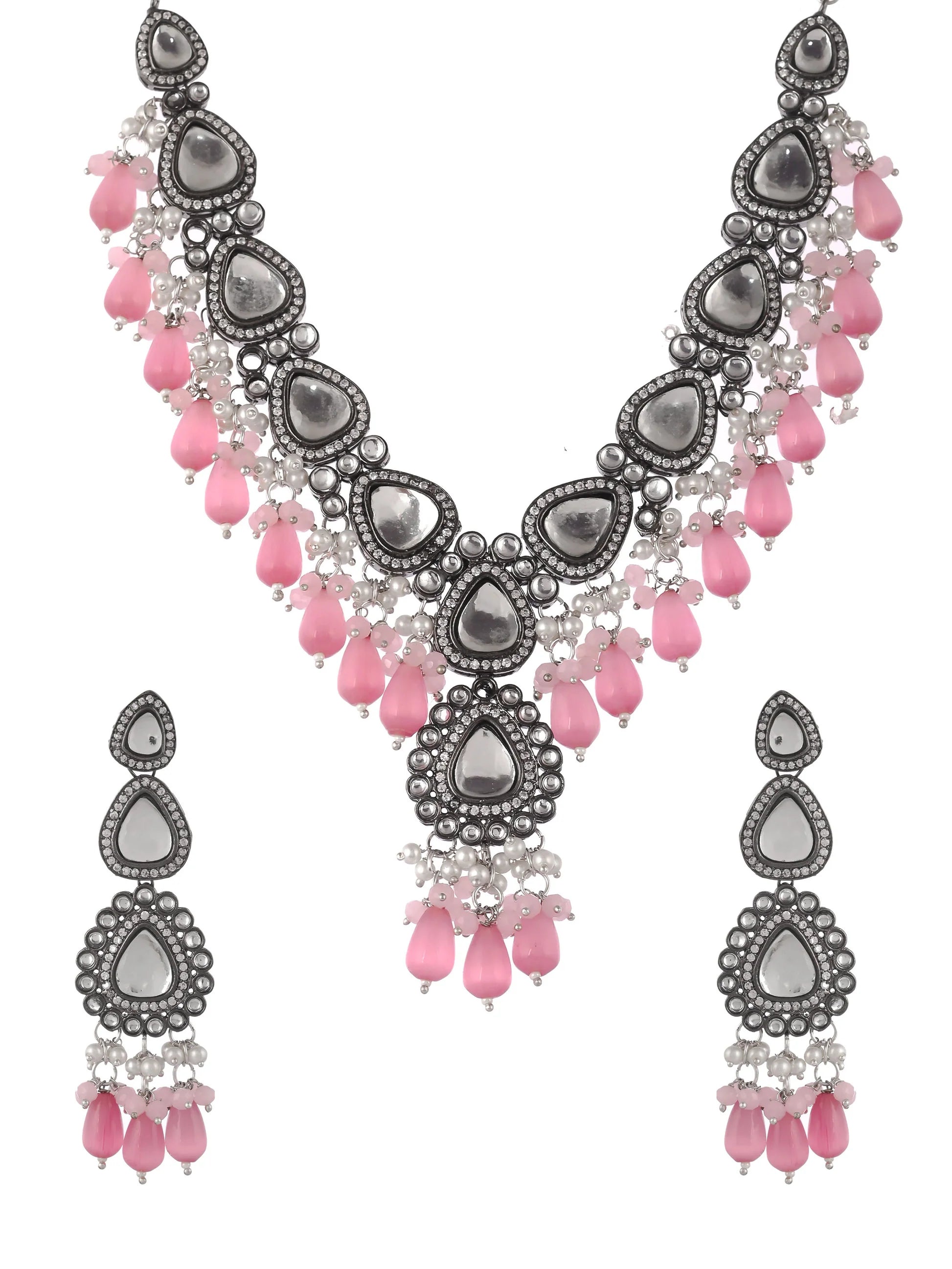 Antique Mirror Kundan Necklace Set with Pink Beads