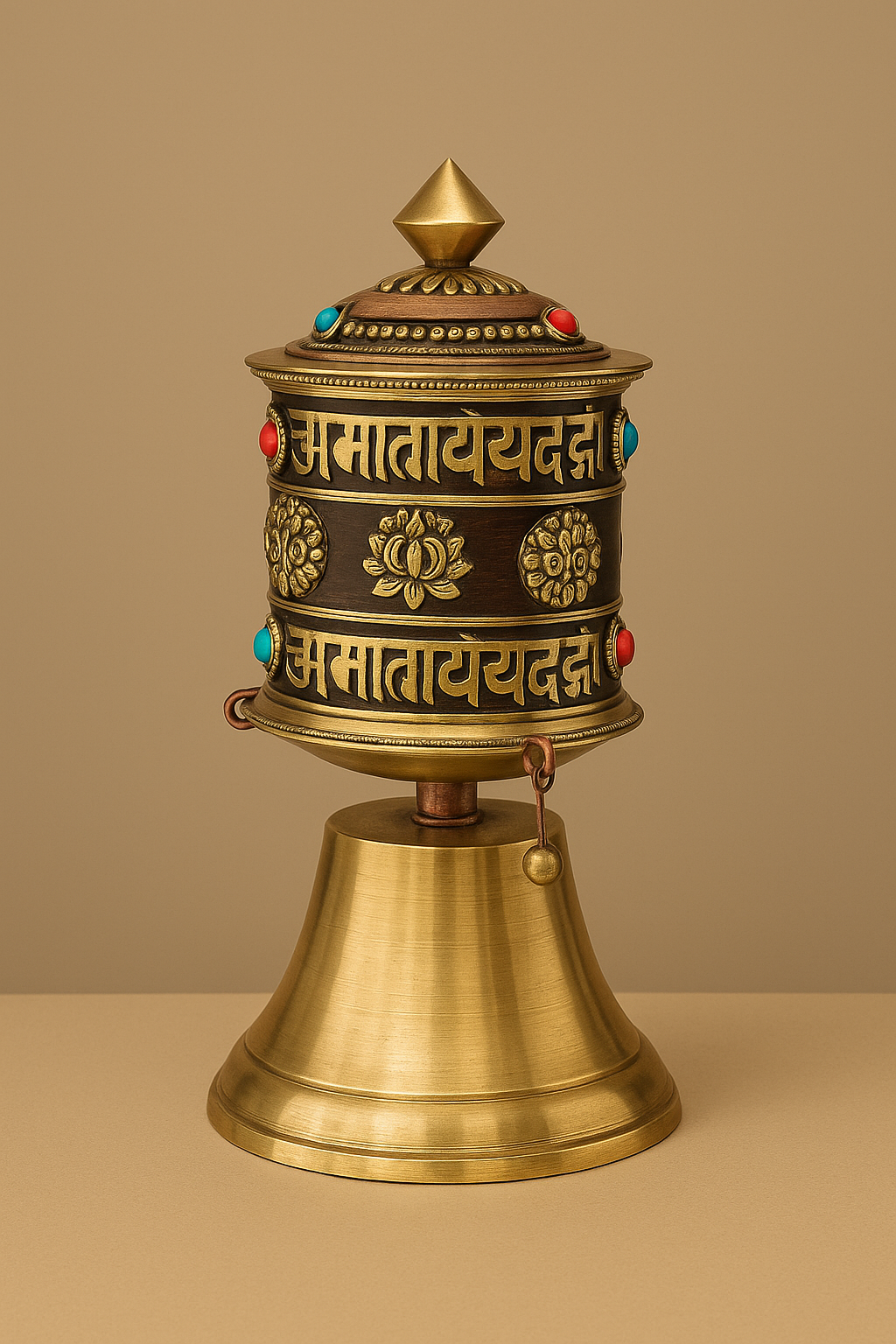 Crafted from high-quality brass with intricate lotus motifs and gemstone inlays, this tabletop prayer wheel is designed for both meditative use and decorative display. The rotating drum is mounted on a sturdy conical base, allowing for smooth, gentle spins that symbolize the spreading of blessings and positive energy.