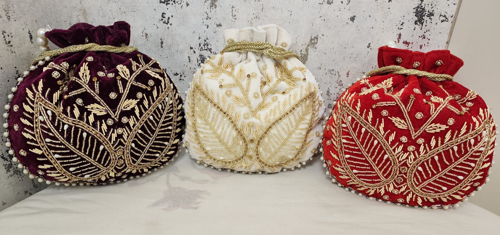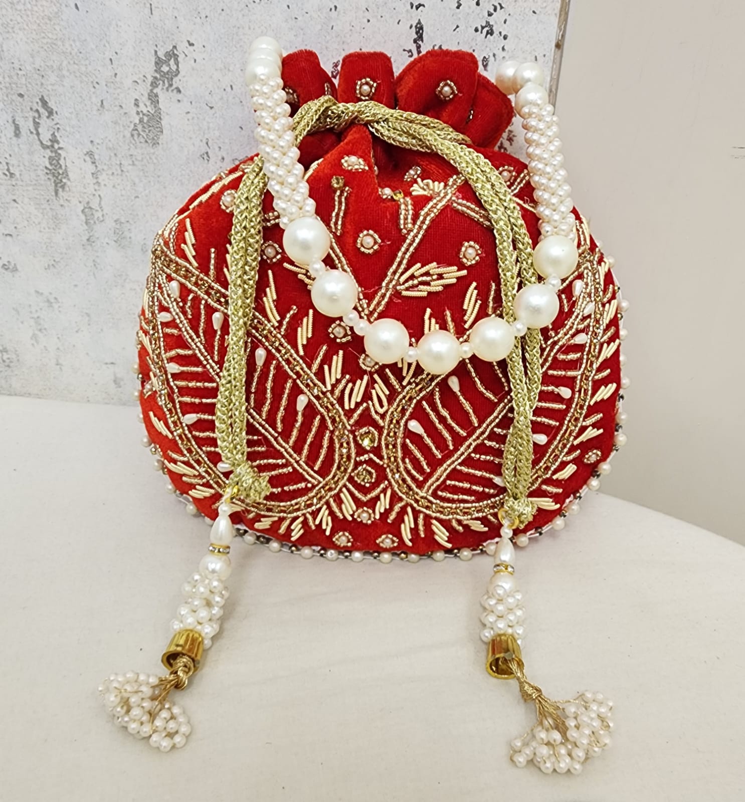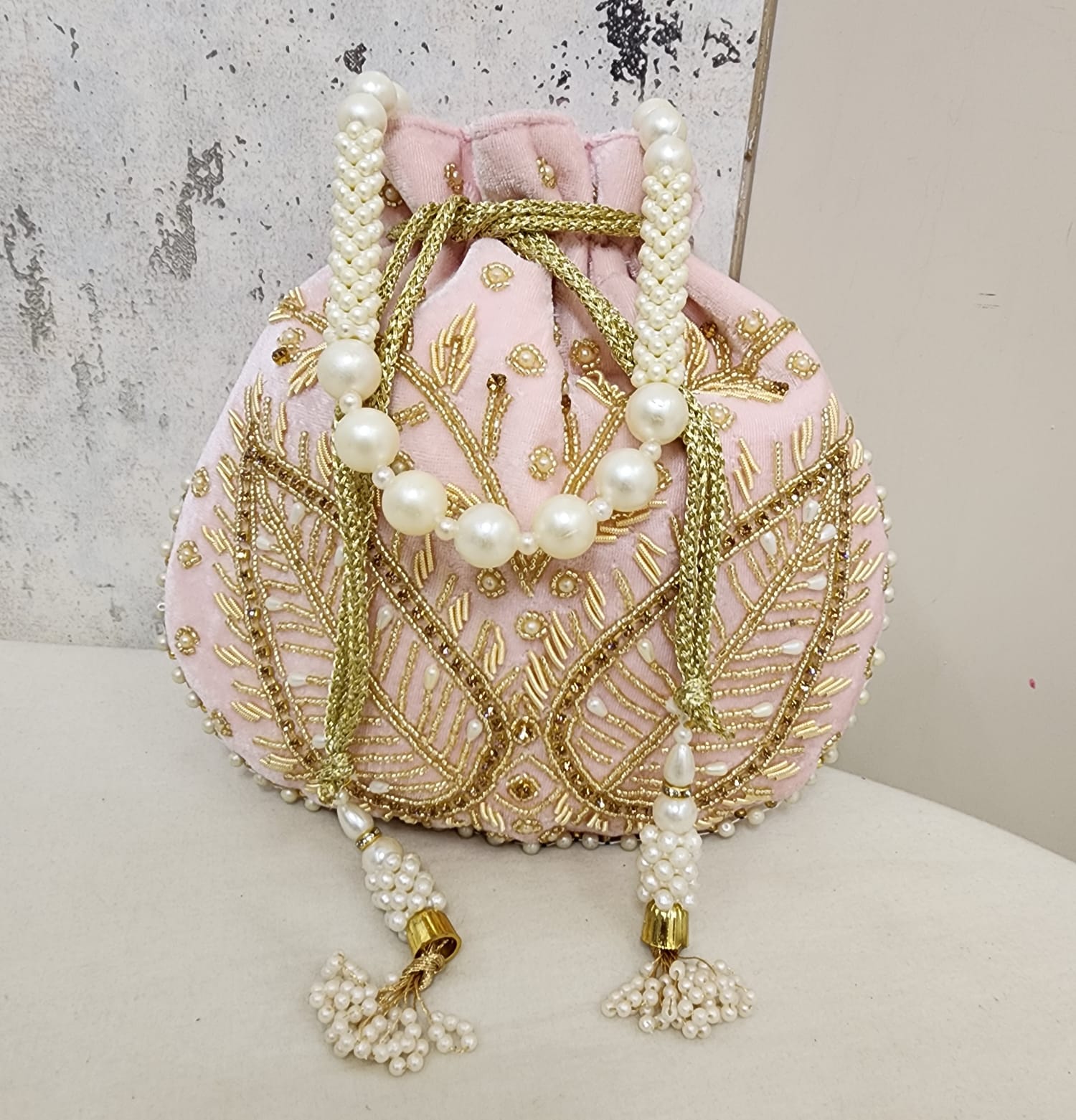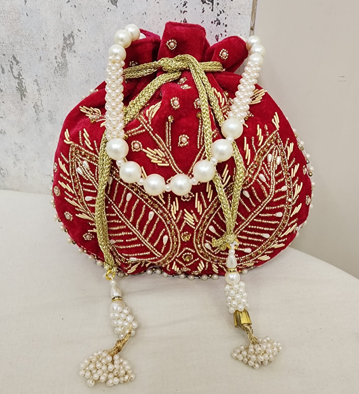 Royal Velvet Potli Bag with Pearl Handle & Zari Embroidery