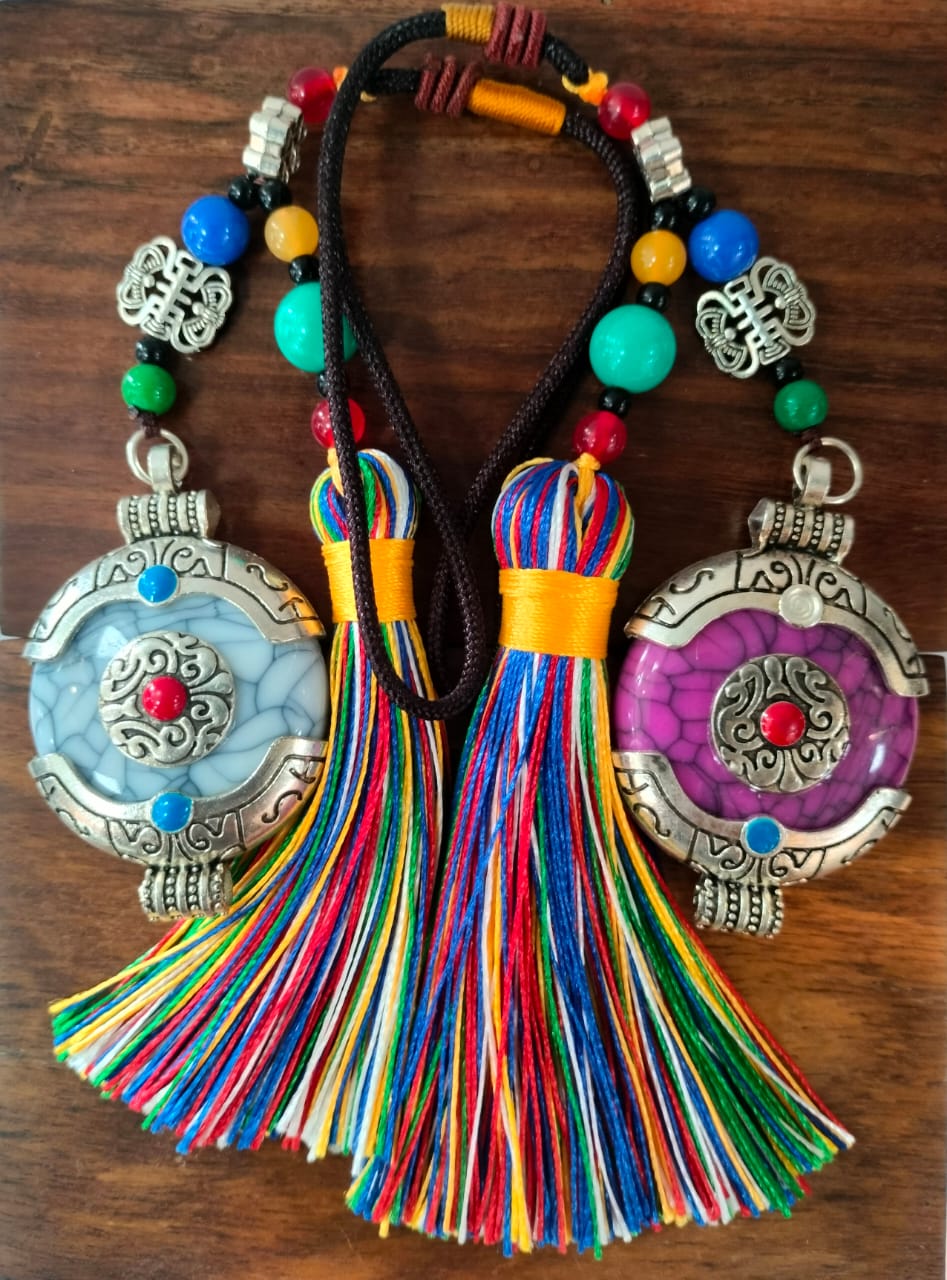Bring peace and spiritual energy wherever you go with this intricately crafted Tibetan Prayer Wheel Keychain. Inspired by traditional Tibetan prayer wheels, this miniature version is adorned with the sacred "Om Mani Padme Hum" mantra in vibrant colors on a golden cylinder, symbolizing compassion and wisdom. The keychain features fine detailing in silver and gold tones with embossed designs and a small charm, making it a meaningful accessory or thoughtful gift.